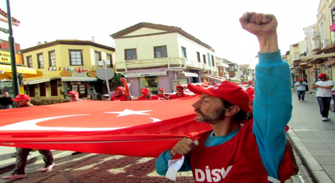 DİSK'e bağlı Genel-İş Sendikası 4 Nolu Şube Çeşme İşyeri Temsilcisi Uğur Boztepe de yaptığı konuşmada, 1 Mayıs'ın, işçilerin uluslararası birlik, mücadele ve dayanışma günü olduğunu vurgulayarak, "1 Mayıs, bugün bizler için çok daha fazla önem taşıyor. Bugün, taşeron işçilerimizin kadro talebini dile getirmemiz gerekiyor. Hükümet, taşeron işçileri uzun süredir kadro vaadi ile oyalıyor. Biz, boş vaadlere kanmıyoruz. Taşeron şirket işçisi olarak değil, kadrolu, güvenceli çalışmak için örgütlü gücümüzle mücadele edeceğiz. Taşeronluk uygulaması başta olmak üzere, güvencesizliğe, işsizliğe, kıdem tazminatının fona devredilmesine, uzun çalışma sürelerine, sefalet ücretine, iş cinayetlerine karşı 1 Mayıs'ta alanlardayız. Güvenceli işe, iş başında sağlığımıza ve işyerimizde güvenliğimize, sendikal haklarımızı ve sendikal örgütlülüğümüzü savunarak kavuşacağız. Bizler adına kimsenin karar vermesine izin vermeyeceğiz. Üreten bizi, yöneten de biz olacağız" şeklinde konuştu.