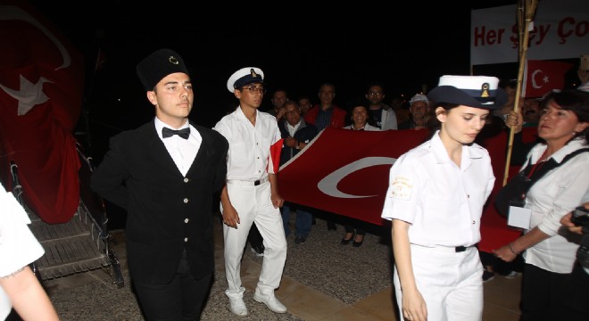 Çeşme Belediyesi'nin desteği ile, Atatürkçü Düşünce Derneği Çeşme Şubesi, Çeşme Denizciler Derneği ve Sarı Zeybek Dans ve Sahne Sanatları Derneği tarafından hazırlanan canlandırma, heyecan yarattı.