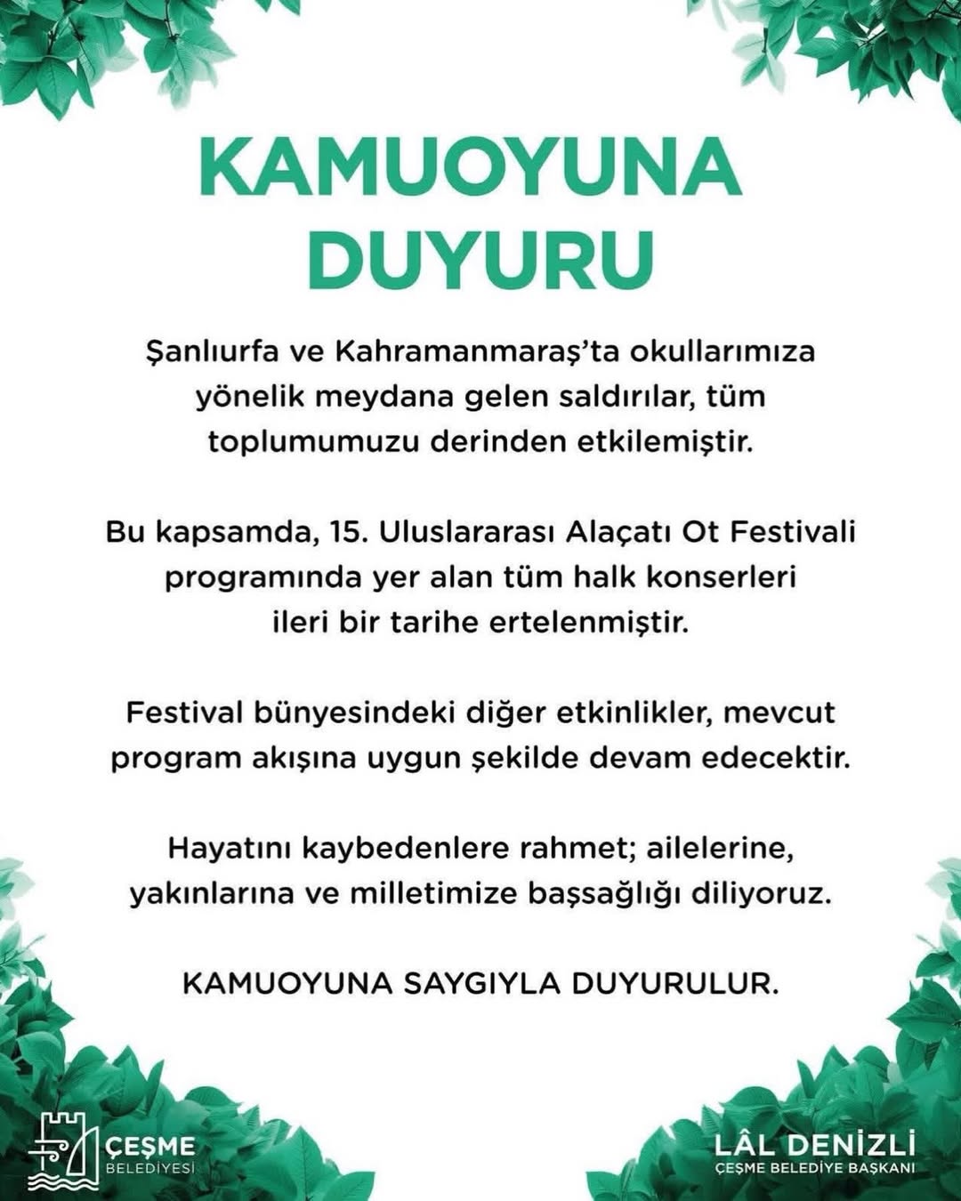 Çeşme Belediyesi, bu yıl 15. kez düzenlenecek olan Alaçatı Ot Festivali'ndeki halk konserlerini erteledi. Şanlıurfa ve Kahramanmaraş'ta gerçekleştirilen okul saldırıları nedeniyle halk konserlerinin ertelendiğini duyuran yetkililer, festival kapsamında diğer programların devam edeceğini açıkladılar.