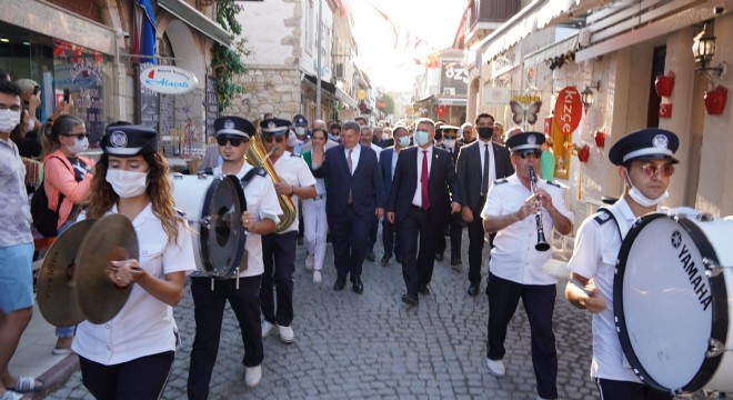 Tören, saat 17.00’de Çeşme Belediyesi Alaçatı Ek Hizmet Binası bahçesinde Kaymakam ve Belediye Başkanı tarafından tebriklerin kabulü ile başladı.