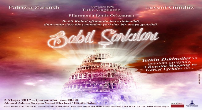 Dünya yıldızlarını İzmirlilerle buluşturan İzmir Büyükşehir Belediyesi Ahmed Adnan Saygun Sanat Merkezi’nde (AASSM), bu kez Babil Kulesi Efsanesi’nden yola çıkılarak hazırlanmış ve 20 farklı ülkenin sevilen eserlerinden oluşan Babil Şarkıları yankılanacak. Ülkelerin kendi dillerden ve kültürlerinden özenle seçilerek hazırlanan zengin repertuvar, büyülü bir atmosferde, 3 boyutlu mapping ve görsel şovlarla sahnelenecek. 64 kişilik Filarmonia İzmir Orkestrası'nın eşlik edeceği, Soprano Patrizia Zanardi ve Tenor Levent Gündüz'ün seslendireceği konserin şefi Tulio Gagliardo olacak. Tiyatro ve sinema sanatçısı Yetkin Dikinciler'in Babil Kulesi efsanesi anlatımı ve sunumları sayesinde mistik bir atmosferde geçecek konser, 3 Mayıs Çarşamba günü saat 20.00’de Büyük Salon’da.