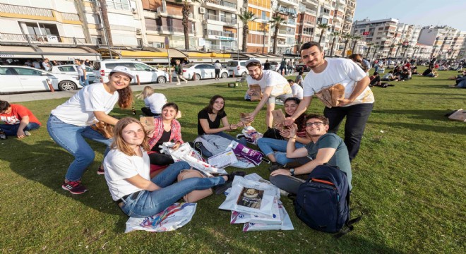 Gönüllü gençler, çimler üstünde Kordon keyfi yapan İzmirlilere kabukların içine atılabileceği özel poşetlerde çiğdem dağıttı.
