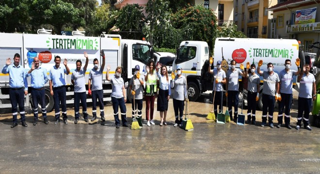 Geçtiğimiz yıl Ağustos ayında 30 ilçede birden uluslar arası standartlardaki 122 temizlik aracı ve 536 personelle temizlik çalışmalarına başladıklarını belirten İzmir Büyükşehir Belediyesi yetkilileri, “Geceleri ana cadde, meydan ve bulvarları yıkıyor, süpürüp temizliyoruz. Sabah saatlerinden itibaren de hem araçlarla hem de elle süpürme işlemi devam ediyor. Atmosfere karbon salımını azaltmak amacıyla elektrikli makine ve ekipmanları tercih ediyoruz. Haftada 1092 kilometre alanı temizleyerek yaklaşık 188 ton katı atığın bertarafını sağlıyoruz. Tertemiz bir İzmir hedefi ile yürüttüğümüz çalışmalara vatandaşlarımızın da desteğini sağlamak için mahalleleri ekledik. İlçe belediyelerin mahalle bazında yürüttüğü temizlik çal ışmalarına temizlik araçlarımız ve personelimiz ile destek veriyoruz. Tertemiz bir İzmir için vatandaşlarımızı da çevrelerini temiz tutmaya davet ediyoruz” dedi.