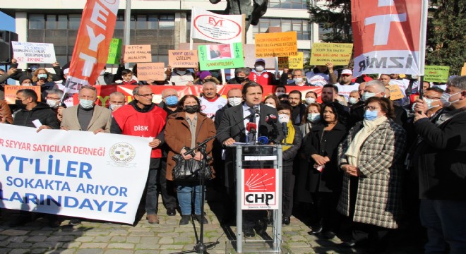 Cumhuriyet Halk Partisi Türkiye genelinde Emeklilikte Yaşa Takılanlar (EYT) için saha inme kararı aldı. İzmir'de CHP İzmir İl Başkanlığı önderliğinde toplanan EYT'liler Atatürk Meydanı'nda bulunan Hasan Tahsin heykeli önünde basın açıklaması düzenledi.