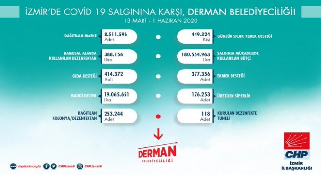 CHP İzmir İl Başkanlığı İzmir'de COVID-19'a karşı Derman Belediyeciliği başlıklı rapor yayınladı. Raporda pandeminin başladığı ilk günlerden yani 13 Mart'tan 1 Haziran'a kadar olan tarih aralığında CHP'li belediyelerin hizmetleri tek tek açıklandı.