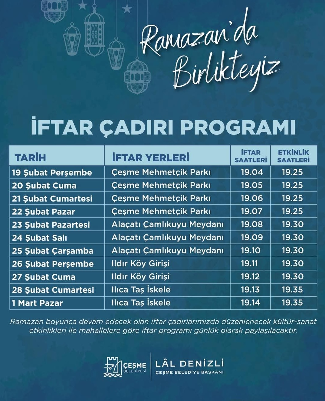 Çeşme Belediyesi'nde yapılan açıklamada ilk iftar çadırı 19 şubat perşembe günü Mehmetçik Parkı'nda kurulacak. Pazar gününe kadar vatandaşların hzmetinde olacak iftar çadıırı 23 şubat pazartesi gününden itibaren Alaçatı Çamlıkuyu'da hizmet vermeye devam edecek.