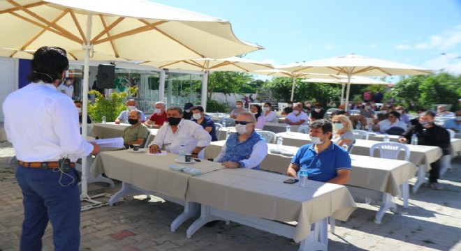 Alaçatı Ek Hizmet Binası’nda açık alanda sosyal mesafe kurallarına göre gerçekleşen eğitimde konuşma yapan Çeşme Belediye Başkanı M. Ekrem Oran, normalleşme sürecinde bir dizi önlem aldıklarını ve bu önlemleri uygulamaya geçirdiklerini kaydederek; “Geçen yıl milyonları ağırladığımız ilçemizde yeni tip Koronavirüs ile mücadele kapsamında normalleşme programlarını tek tek hayata geçiriyoruz. Önceliğimiz işletmelerin gerekli tedbirleri alması. Bu konuda denetimlerimizi sıklaştıracağız” dedi.