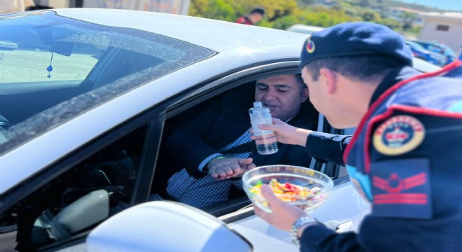 Çeşme Jandarma İlçe Komutanlığına bağlı ekipler bayramın birinci gününde tatilcileri şeker ve kolonya ile karşıladı.