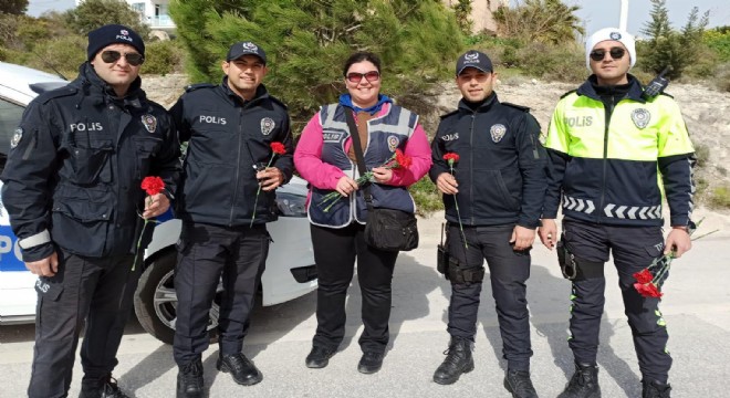 Çeşme İlçe Emniyet Müdürlüğü, 8 Mart Dünya Kadınlar Günü nedeniyle güvenlik uygulaması yapılan bölgelerde kadınlara çiçek verdi.