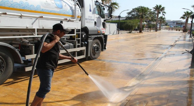 Temizlik çalışmaları kapsamında, Çiftlik Mahallesi, Ilıca Mahallesi, Çeşme merkezindeki sahil bandı ve çarşısı ile Alaçatı Mahallesi sokakları da yıkanacak.