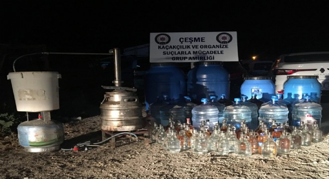 Çeşme'de 1 kişi kaçak içkiden zehirlenerek hastaneye kaldırılırken, kaçak içkiyi aldığı kişinin evinde yapılan aramada, alkol üretiminde kullanılan düzenek ve çok miktarda kaçak içki ele geçirildi.
