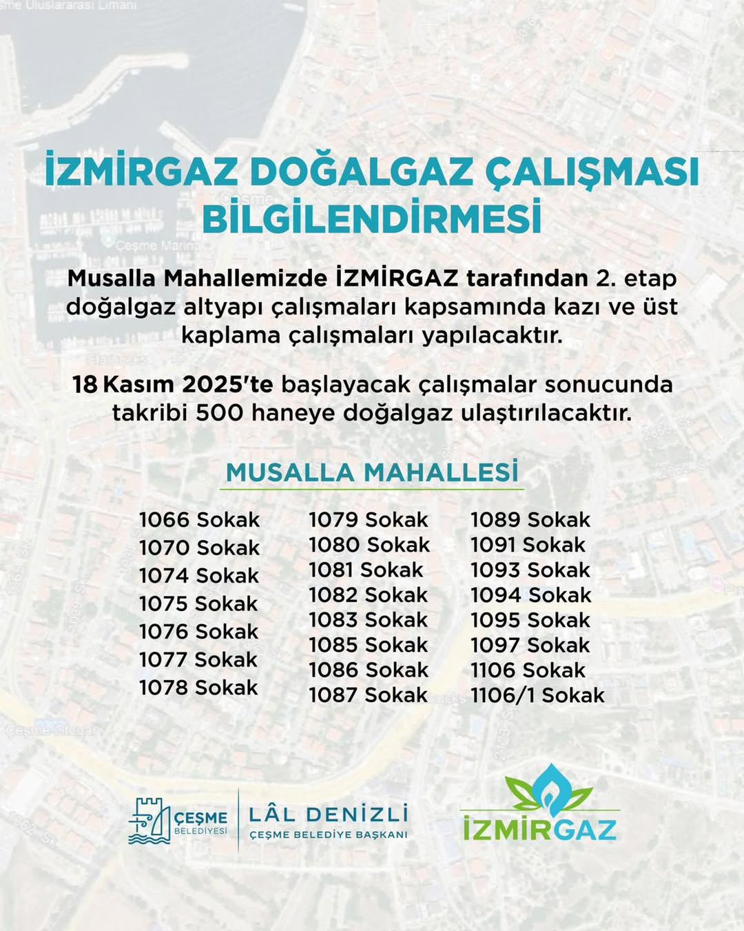 Çeşme Belediyesi ve İzmirGaz iş birliği ile pilot bölge olan Musalla Mahallesi’nde yürütülen altyapı çalışmaları sonucu, Çeşme ilk kez doğal gaz ile buluşmasının ardından İZMİRGAZ’ın 2. etap altyapı çalışmaları 18 Kasım 2025’te başlıyor.