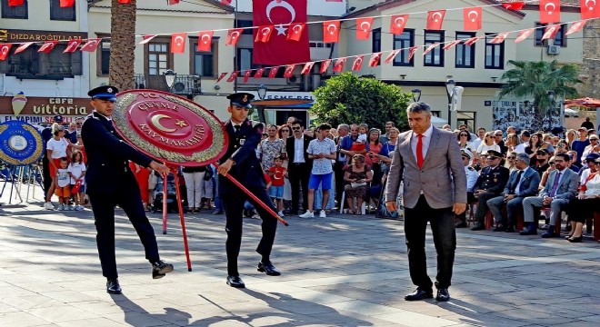 Resmi tören, Çeşme Kaymakamlığı ve Çeşme Belediye Başkanlığı çelenklerinin Atatürk Anıtı'na sunulmasının ardından, saygı duruşu ve İstiklal Marşı eşliğinde göndere bayrak çekilmesi ile başladı.