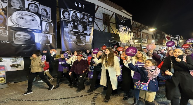 Çeşme Mehmetçik Parkı’nda toplanan kalabalık, “Kadına Şiddete Hayır” sloganları eşliğinde Cumhuriyet Meydanı’na yürüdü.