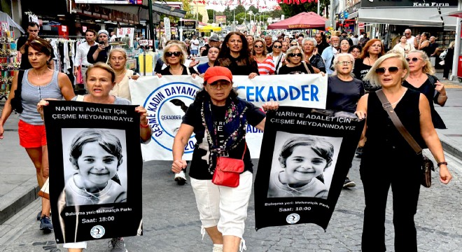 Çeşme Mehmetçik Meydanı’nda toplanan grup, ‘Narin’e adalet istiyoruz.’ sloganları atarak Çeşme Cumhuriyet Meydanı’na yürüdü.