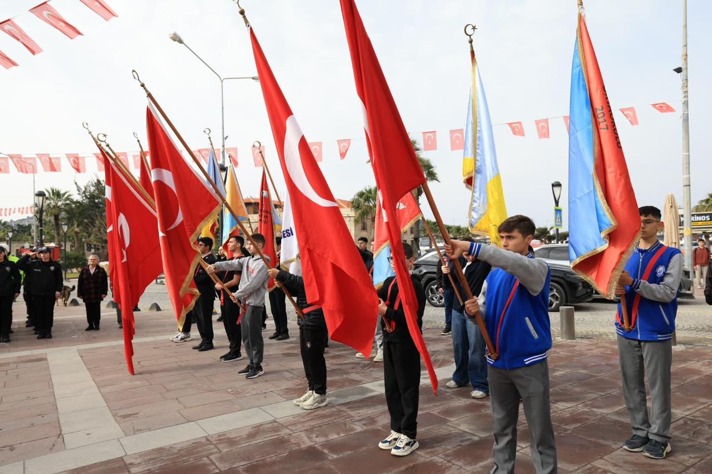 Program, Cumhuriyet Meydanı’nda gerçekleştirilen çelenk sunma töreniyle başladı. Çeşme Kaymakamlığı, Garnizon Komutanlığı, Çeşme Belediye Başkanlığı ile Türkiye Harp Malulü Gaziler, Şehit Dul ve Yetimleri Derneği İzmir Şubesi temsilcileri tarafından Atatürk Anıtı’na çelenk sunuldu.