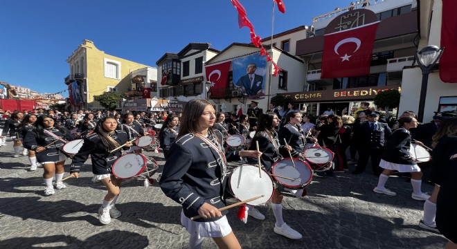 Çeşme'deki 29 Ekim Cumhuriyet Bayramı resmi töreni, Çeşme Kaymakamı Mehmet Maraşlı'nın makamında tebrikleri kabulü ile başladı. Tebrik kabulünün ardından Mehmetçik Meydanı'ndan başlayan kortej yürüyüşüne, Çeşme Kaymakamı Mehmet Maraşlı, eşi Arzu Maraşlı ve oğlu Mehmet Akif ile birlikte katıldı. Çeşme Belediye Başkanı Lal Denizli, İlçe Protokolü, kurum amirleri, belediye meclis üyeleri, siyasi parti ve sivil toplum kuruluşları temsilcileri, oda temsilcileri ve vatandaşların katıldığı kortej yürüyüşü, öğrenci bandosu eşliğinde Cumhuriyet Meydanı'na kadar sürdü.
