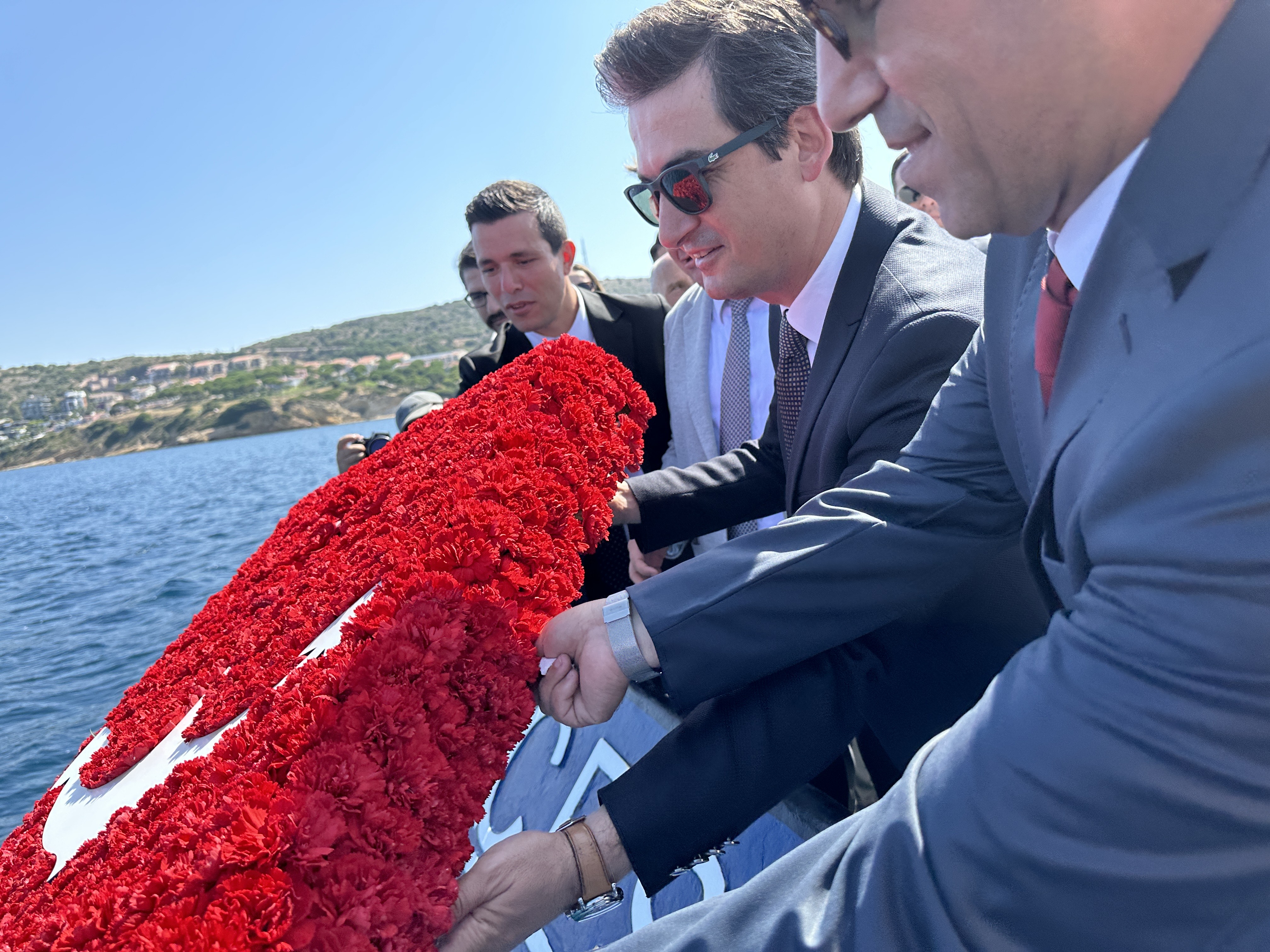 Konuşmanın ardından törene katılan protokol üyeleri ve vatandaşlar römorkör ile denize açıldı. Sahil Güvenlik botları eşliğinde denize açılan römorkörden, Deniz şehitlerimiz anısına hazırlanan çelenk Çeşme Kaymakamı Mehmet Maraşlı ve ilçe protokolü tarafından denize bırakıldı.
