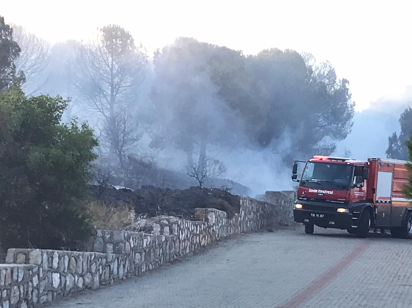 Çeşme şehir merkezindeki Karadağ bölgesinde, fıstık çamı ağaçlandırma sahasında yangın çıktı. Rüzgar nedeniyle yangın bir anda büyüdü. İzmir Orman Bölge Müdürlüğüne bağlı ekipler, yangına müdahale etmeye başladı. Ekipler, 2 helikopter ve 3 arazözle havadan ve karadan müdahale ettiği öğrenildi. Öte yandan, İzmir Büyükşehir Belediyesine Belediyesine bağlı itfaiye ekipleri de söndürme çalışmalarına katıldı. Yerleşim yerlerine yakın olan yangın, paniğe yol açtı. Yangının, evlere ve çamlık alanda bulunan Anadolu Lisesi'ne sıçramaması için ekipler helikopterlele müdahale gerçekleştiriyor.
