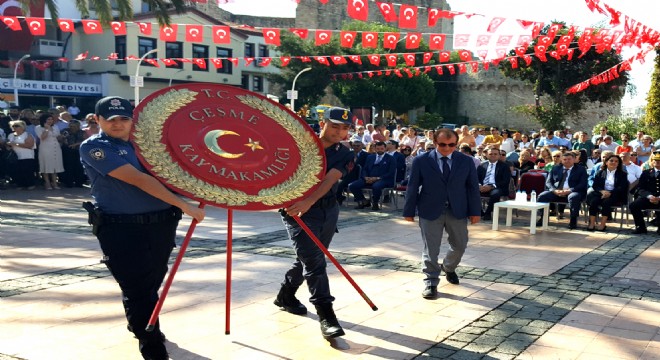 Saygı duruşu ve İstiklal Marşı’nın okunmasının ardından, Çeşme Belediye Başkanı Ekrem Oran, günün anlam ve önemini belirten bir konuşma yaptı. Belediye Başkanı Oran, “Ulu Önder Mustafa Kemal Atatürk’ün 19 Mayıs 1919’da Samsun’a çıkışı ile başlayan, 30 Ağustos’ta zaferle taçlanan, 9 Eylül’de güzel İzmir’in düşman işgalinden kurtuluşu ile son bulan, her cephesi destanlarla dolu, adını bildiğimiz, bilmediğimiz binlerce kahramanlar ile yazılmış kurtuluş destanımızın son adımlarından biri olan Çeşme’mizin kurtuluşunun 97. Yılı kutlu olsun” diyerek başladığı konuşmasında, “Bağımsızlık aşkıyla canlarını feda ederek bize bu güzel vatanı armağan eden, başta Mustafa Kemal Atatürk ve silah arkadaşlarını, cephede düşmanla göğüs göğüse çarpışan erlerimizi, sırtında bebeği, ayağında çarığı ile, kağnılarla cepheye silah taşıyan kahraman analarımızı rahmet ve minnetle anıyorum” diye kaydetti.