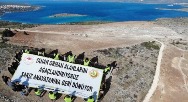 İzmir Orman Bölge Müdürlüğü, Çeşme ilçesinde yangından zarar gören ormanlık alanda 5 bin sakız ağacını toprakla buluşturdu.