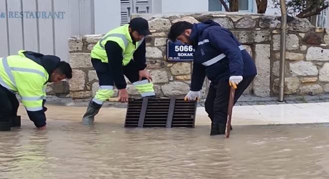 Sabahın ilk ışıkları ile tatilin ikinci gününe başlayan Çeşme'de şiddetli yağış devam ederken Çeşme Belediyesi2ne bağlı Temizlik ve Fen İşleri Müdürlüğü ekipleri tam kadro saha çalışması gerçekleştiriyorlar.