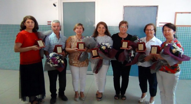 Çeşme Adliyesi'nde 41 yıldır görev yapan Ali Bahar, 38 yıldır görev yapan Seher Sümen, 37 yıldır görev yapan Reyhan Çavdar, 28 yıldır görev yapan Birgül Sönmez ve 27'şer yıldır görev yapan Negül Yılmaz ve Nazan Tufan, Çeşmeli Avukatlar'dan onur plaketlerini aldılar.