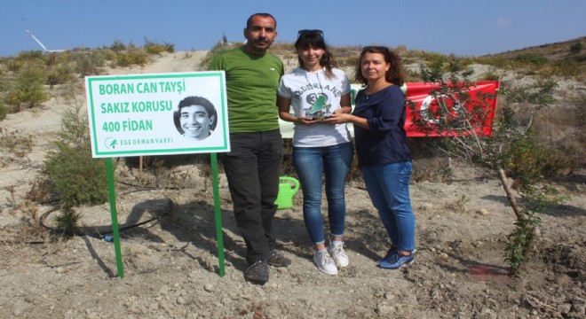 Ege Orman Vakfı işbirliği ile Çeşme-Çiftlikköy sakız ağaçlandırma sahasında oluşturulan koruda düzenlenen fidan dikim töreninde duygusal anlar yaşanırken sakız fidanları Boran Can Tayşi anısına dikildi.