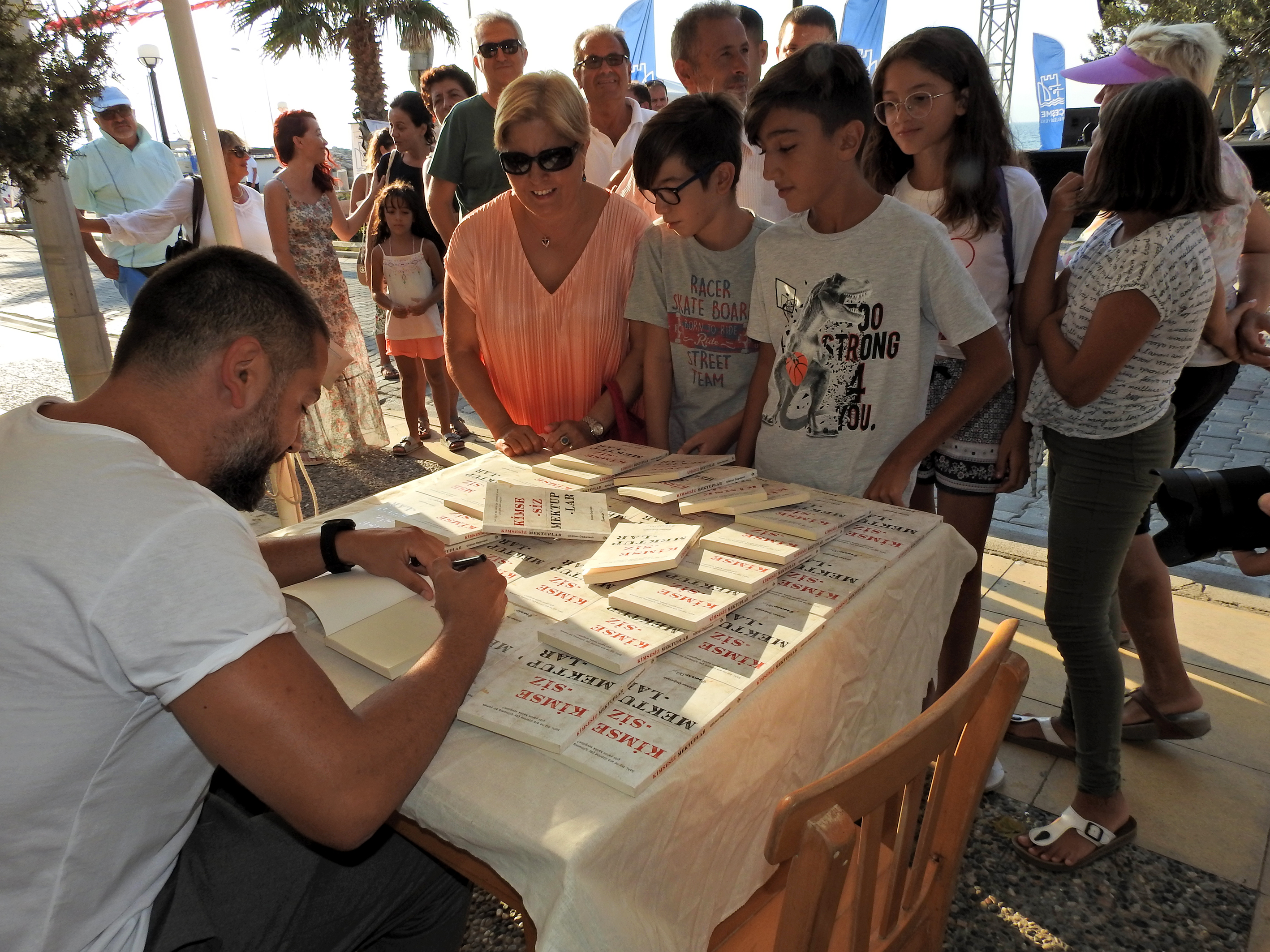 Yazar Gökhan Dağıstanlı, söyleşisinin ardından, söyleşiyi izleyenlere Çeşme Belediyesi tarafından hediye edilen "Kimsesiz Mektuplar" adlı kitabını imzaladı.