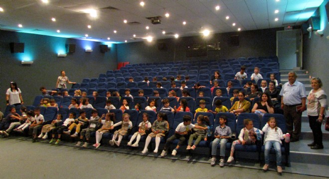 Çeşme Belediyesi ve Çeşme Milli Eğitim Müdürlüğü'nün destekleriyle düzenlenen film gösterisinde, iki gün boyunca altı seansta, 432 anaokulu ve ilkokul birinci sınıf öğrencisi, "Maşa ve Koca Ayı" adlı animasyon filmini izliyorlar.
