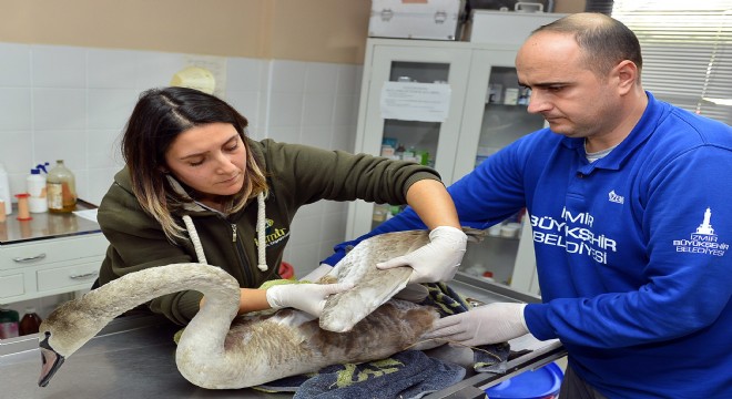 Uçarken yorulup İzmir Doğal Yaşam Parkı’ndaki Kuğu Gölü’ne iniş yapan 6 aylık beyaz kuğu, tedavi altına alındı.