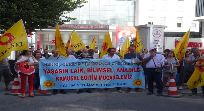 Eğitim-Sen üyeleri İzmir İl Milli Eğitim Müdürlüğü önünde bir araya gelerek müfredat değişikliğine karşı basın açıklaması yaptı. Eğitim- Sen İzmir 1 No'lu Şube Başkanı Necip Vardal, TEOG'un kaldırılarak yerine başka bir sınav sisteminin getirilmesinin eğitimde başarısızlık olduğunu söyledi. İzmir İl Milli Eğitim Müdürlüğü önünde toplanan Eğitim-Sen üyeleri basın açıklaması yaptı. 2017- 2018 eğitim yılının sorunlarla başladığını öne süren Eğitim-Sen İzmir 1 No'lu Şube Başkanı Necip Vardal, grup adına yaptığı basın açıklamasında, bugünün eğitim alanına yönelik çok yönlü saldırı ve tehditlerin yaşandığı, laik, bilimsel eğitim anlayışına açıkça meydan okunan dönemin ilk günü olduğunu öne sürdü. Milli Eğitim Bakanlığı'nın eğitim sistemini yaptığı değişikliklerle yap-boz tahtasına çevirdiğini ileri süren Vardal, "Son olarak yeni müfredat ve TEOG üzerinden yürütülen tartışmalarda görüldüğü gibi öğrenci ve velilerin kafasını karıştırmak dışında eğitimde somut ve çözüme dayalı politikalar geliştirmek yerine, eğitimde yaşanan kaosu derinleştirecek adımlar atılmaktadır" dedi. Yeni müfredatın öğretim programları ve ders kitaplarında doğrudan bilim, felsefe, tarih ve sanat dersleri hedef alınarak, ideolojik ayıklama yapıldığını ileri süren Vardal, "Başta Fen bilimleri olmak üzere bilim derslerinde ünite ve kazanım sayıları azaltılmış, tarih dersleri başta olmak üzere, pek çok ders iktidarın dünya görüşüne paralel şekilde düzenlenmiştir" iddiasında bulundu.