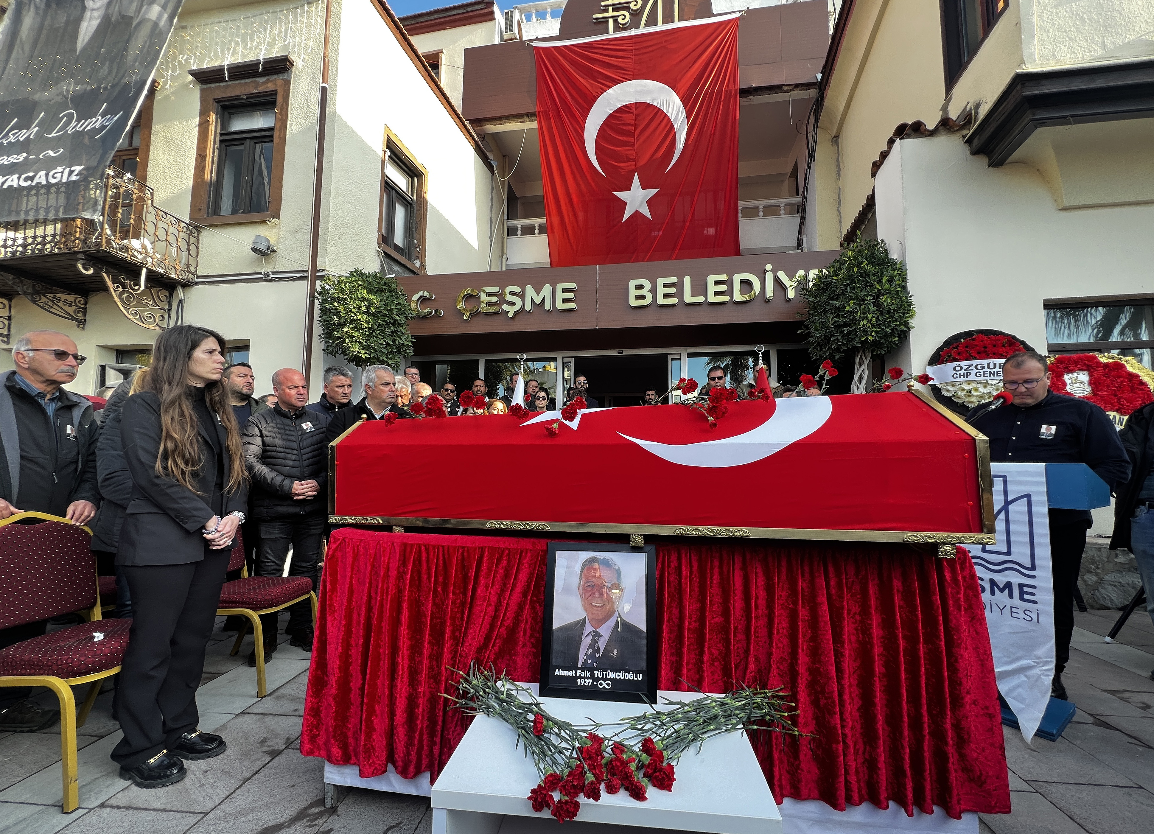 Çeşme’de 1989–2014 yılları arasında aralıklarla toplam 20 yıl belediye başkanlığı yapan Ahmet Faik Tütüncüoğlu için bugün Çeşme Belediyesi önünde askeri tören düzenlendi. Törene CHP Genel Başkanı Özgür Özel çelenk gönderirken; Çeşme Kaymakamı Mehmet Maraşlı, Çeşme Belediye Başkanı Lal Denizli, İzmir Büyükşehir Belediyesi önceki dönem Başkanı Aziz Kocaoğlu, Çeşme Belediyesi önceki dönem Başkanı Muhittin Dalgıç, Alaçatı Belediyesi önceki dönem Başkanı Remzi Özen, Çeşme Belediyesi önceki dönem Başkanı Ekrem Oran, Güzelbahçe Belediyesi önceki dönem başkanı Hülya Yarbuz, CHP eski milletvekili Alaaddin Yüksel, CHP eski milletvekili Mehmet Ali Susam, İzmir Ticaret Odası eski Başkanı Ekrem Demirtaş, eski Konak Belediye Başkanı Ahmet Sarılsın, Tütüncüoğlu ailesi, sevenleri, protokol üyeleri, siyasi parti ve STK temsilcileri ile çok sayıda vatandaş katıldı.