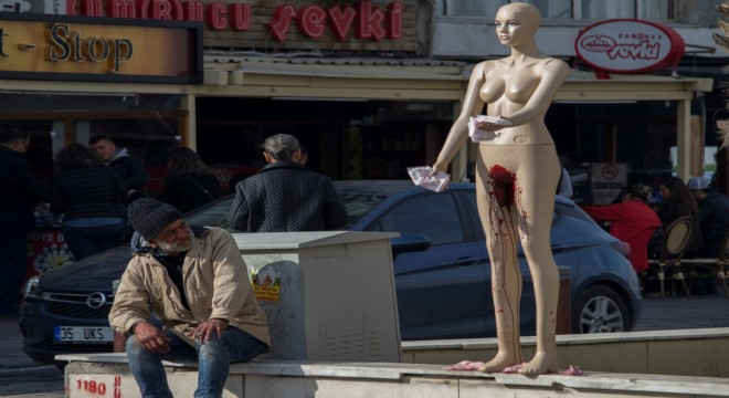 Sanatçılar, cansız bir kadın mankeni, regl gören bir kadın olarak Alsancak’ın farklı sokaklarında sergileyerek kadınların sadece fiziksel şiddete değil, psikolojik de şiddet gördüğünü yansıttı.
