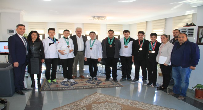 Öğrenciler ve öğretmenler, kazandıkları ödüllerle birlikte, Belediye Başkanı Muhittin Dalgıç'ı ve İlçe Milli eğitim Müdürü Bahattin Gengörü'yü makamında ziyaret ederek teşekkürlerini sundular.