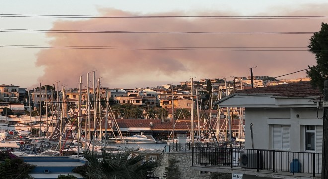 Bugün öğleden sonra Gerence Körfezindeki yangın etkisini sürdürüyor. Yangına Urla Belediyesi itfaiye ekipleri müdahale ederken yangının bulutları Çeşme'den görülüyor.