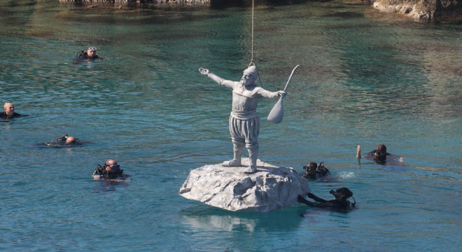 Eşek Adası'nın yanında bulunan Makri Adası'na kadar tekneyle getirilen iki heykel, vinçle ve dalgıçların yardımıyla suya batırılırken, Grand Star gezi teknesinde bulunan STK temsilcileri ve vatandaşlar da heykellerin batırılışını cep telefonları ile görüntülediler.