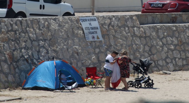 Çeşme Belediyesi himayesindeki Ilıca Plajı’nda yasak olmasına rağmen vatandaşların uyarı levhasının hemen altında çadır kurması şaşkınlık yarattı.