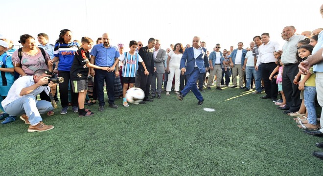 Daha sonra sahaya inen Başkan Aziz Kocaoğlu, Bahri Altıntabak'ın adı verilen futbol sahasının açılış vuruşunu da gerçekleştirdi.