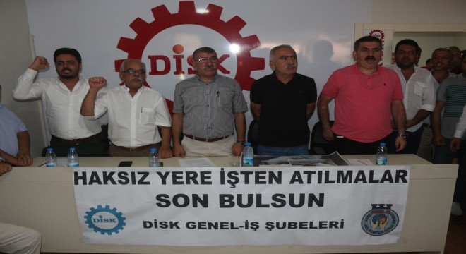 İlk olarak ortak basın metnini okuyan Genel İş İzmir 3 Nolu Şube Başkanı Güral Doğan, İzmir Büyükşehir Belediyesi'nin işten çıkarma gerekçesi olarak sunduğu performans düşüklüğü, verimsizlik ve disiplinsizliğin gerçeği yansıtmadığını ifade ederek " Uzun yıllar çalışmanın sonucunda ve ağır iş koşullarında çalışmanın getirmiş olduğu sebeplerden dolayı, yaşanan rahatsızlıklarımız heyet raporlarıyla belgelenmiş, ameliyat olmuş, tedavi görmüş ve işine devam etmekte olan işçileri heyet raporu aldın, işime yaramıyorsun diye işten çıkarmak insani ve ahlaki değildir" dedi.