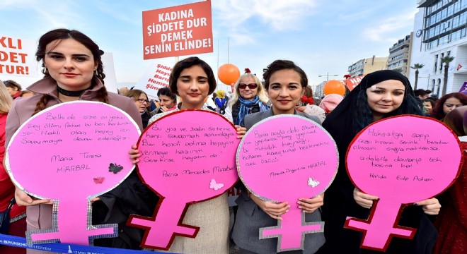 "25 Kasım Kadına Yönelik Şiddete Karşı Uluslararası Mücadele Günü" kapsamında İzmir Büyükşehir Belediyesi tarafından Alsancak Vasıf Çınar Meydanı'nda düzenlenen açılış programı ve yürüyüşe Belediye Başkanı Aziz Kocaoğlu ve eşi Dr. Türkegül Kocaoğlu'nun yanı sıra tanınmış sanatçı Füsun Demirel de katıldı.