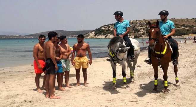 Astsubay biniciler eşliğinde devriyeye ilk olarak Çeşme Pırlanta plajında başlayan Jandarma Atlı Birliklerine tatilcilerin ilgisi yoğun oldu.