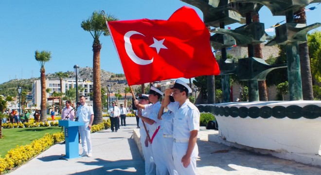 Çeşme Liman Başkanı Eray Aykanat'ın Deniz Şehitliği anıtına çelenk sunmasıyla başlayan tören, saygı duruşunu takiben İstiklal Marşı'nın söylenmesi ile devam etti.
