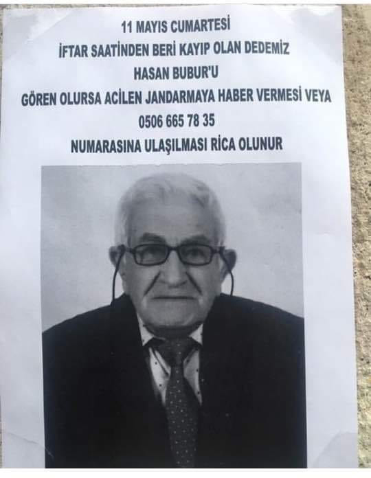 90 yaşında olan Hasan Basri Bubur'un kızı Peyman Bubur, demans hastası babasının Cumartesi akşamı evden çıktığını ve bir daha dönmemesi üzerine jandarmadan yardım istedi.