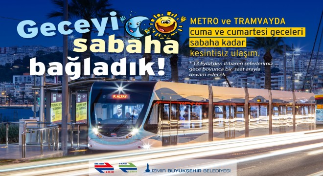 Cuma günlerini cumartesiye, cumartesileri ise pazara bağlayan gecelerde İzmir Metro ile Konak ve Karşıyaka tramvayları seferlerini ara vermeksizin sürdürecek. Seferler saatte bir gerçekleştirilecek. Böylece cuma günleri sabah başlayan metro ve tramvay işletmesi, pazar gece yarısına kadar ara vermeksizin devam edecek.