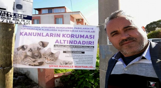 Çeşme'nin Şifne Mahallesi Muhtarı Hasan Ovalı, mahallesine astığı pankartla, sokak hayvanlarının yasayla koruma altında olduğunu hatırlattı.