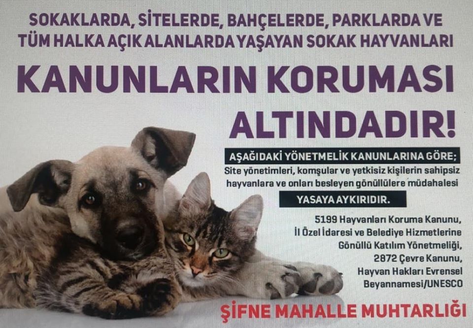 Şifne Mahallesi Muhtarı Ovalı, sokak hayvanlarının yasa ve yönetmeliklerle koruma altında olduğunu, sahipsiz hayvanlarla, onları besleyen gönüllülere müdahalenin yasalara aykırı olduğunu, özel olarak hazırlattığı pankarta yazdırarak, mahallesine astı.