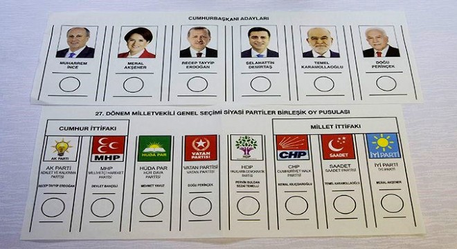 Cumhurbaşkanı adayları için hazırlanan oy pusulasında birinci sırada CHP'nin adayı Muharrem İnce, ikinci sırada İYİ Parti Genel Başkanı Meral Akşener, üçüncü sırada Cumhur İttifakı'nın adayı Cumhurbaşkanı Recep Tayyip Erdoğan, dördüncü sırada HDP'nin adayı Selahattin Demirtaş, beşinci sırada Saadet Partisi Genel Başkanı Temel Karamollaoğlu, altıncı sırada da Vatan Partisi Genel Başkanı Doğu Perinçek yer aldı.