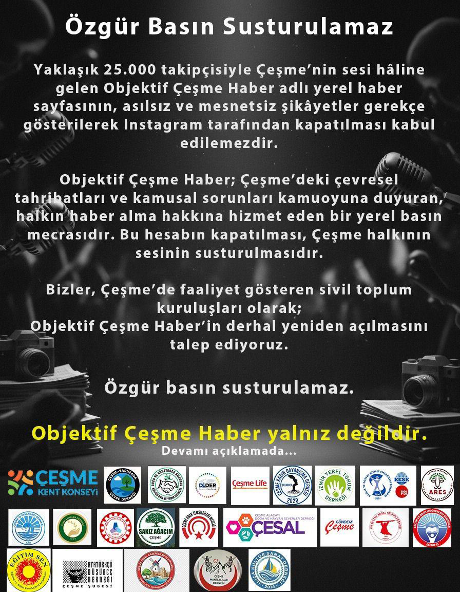 “Çeşme’de uzun yıllardır Instagram üzerinden yayın yapan ve yaklaşık 25.000 takipçisiyle kentin sesi hâline gelen Objektif Çeşme Haber adlı haber sayfasının, asılsız ve gerçek dışı şikâyetler gerekçe gösterilerek Instagram tarafından kapatılmasını büyük bir kaygı ve üzüntüyle öğrenmiş bulunuyoruz.