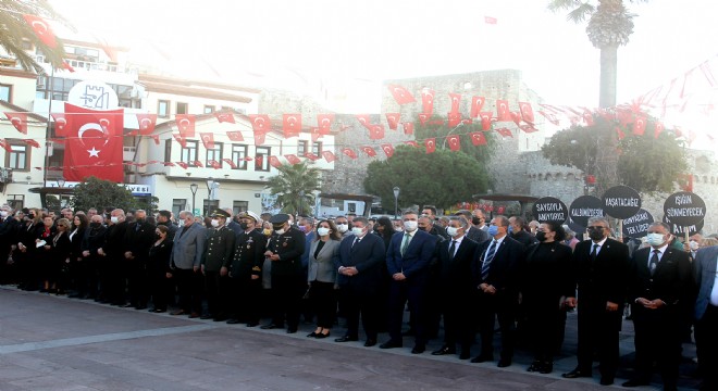 Saatler 09.05’i gösterdiğinde Ilı Önder Mustafa Kemal Atatürk’ün manevi huzurunda iki dakikalık saygı duruşu ve İstiklal Marşı’nın okunması ile birlikte sirenler eşliğinde gönderdeki bayraklar yarıya indirilerek Cumhuriyet Meydanı’nda düzenlenen tören sona erdi.